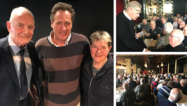 På bilden syns Ulf Sterner, Jens Lind och Pia Sterner - Jan Andersson, ordförande, uppvakta, Hedersmedlemmen, Håkan ”Lillis” Olsson - ÖLIS årsmötesdeltagare.